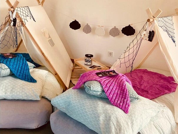 Houd jij van zeemeerminnen en vriendinnen? Dan is dit thema echt iets voor jou. Met 2 Phillips Color lampen kleurt de kamer oceaan blauw en paars! Met Ibiza style accessoires voel je de strandvibes en slapen doe je in speciale gehaakte zeemeermin slaapzakken. Een lange (echte) schelpenketting met verlichte parels geven ’s nachts subtiel, maar super-sfeervol licht. Met een grote kletspot raak jij niet uitgepraat met jouw meiden, doe je challenges met de meegeleverde karaoke microfoon of misschien durf je zelfs de meegeleverde water twitster in badpak/bikini te spelen? Maar… de echte klap op de vuurpijl is de professionele bellenblaasmachine! Ben jij klaar voor een onderwaterdisco?